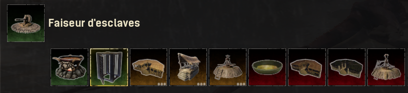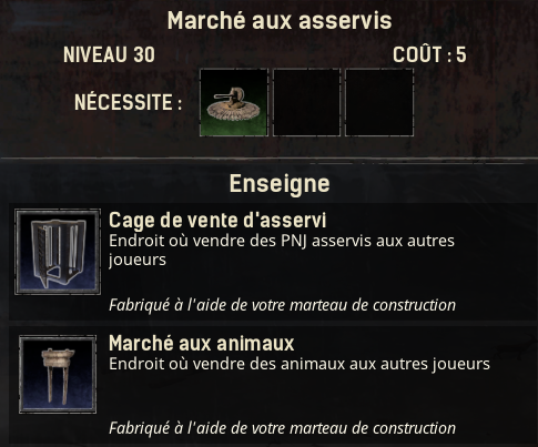 La compétence Marché aux asservis est disponible au niveau 30 (nécessite la compétence "Faiseur d’esclaves") et coute 5 points. Elle débloque la construction de deux nouveaux objets à l’aide du Marteau de construction.