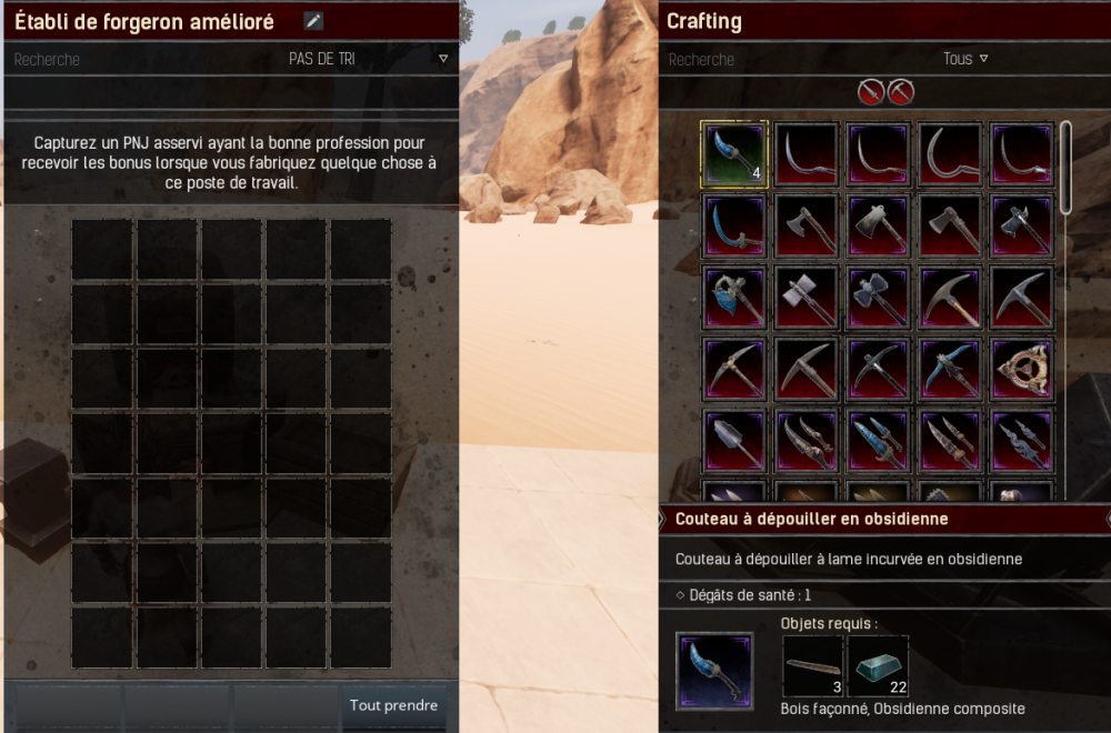 Ici, je peux construire le couteau en obsidienne alors que je n'ai pas déposé les composants nécessaires sur l'établi. Ils sont en fait dans mon inventaire et je n'ai plus besoin de les déplacer: